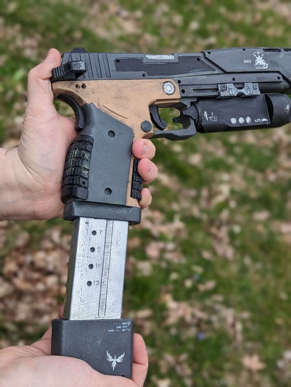 Listed here is a 3D printed and hand finished Smart Pistol MK6! Comes with one removable mag that is held in with small magnets! All finishing, painting, and decals are done by hand, but if you want to do it all yourself a printed kit is available! I've made this as accurate in size and design as I can, so itll be sure to be a talking piece!
